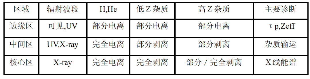 而在大中型裝置上,等離子體輻射逐漸向短波移動(dòng),主要探測(cè)區(qū)域?yàn)樽贤?、真空紫外?X 射線。在大中型裝置上,芯部區(qū)域的 C、N和 O等輕雜質(zhì)離子的外層電子被完全剝離。而高Z金屬雜質(zhì)離子由于電離能較高,并未完全電離,仍可以在較短波段(極紫外和X射線波段)觀測(cè)到其輻射的線狀譜線。不同區(qū)域的光譜行為和主要探測(cè)項(xiàng)目也有所不同。這些波段的范圍、分光方法、探測(cè)元件可見(jiàn)下圖: