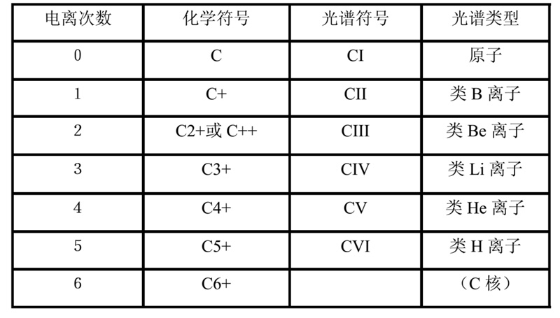 在等離子體參數(shù)較低的小型托卡馬克裝置上,等離子體的輻射主要位于真空紫外和可見(jiàn)光波段。下圖為捷克一個(gè)小托卡馬克裝置 CASTOR 中的等離子體發(fā)射光譜,主要在真空紫外和可見(jiàn)光波段。其線狀譜主要是 O,N和 C 的雜質(zhì)譜線。從等離子體發(fā)射光譜圖上可以較為容易地辨別等離子體中雜質(zhì)的種類和電離狀態(tài)。以 C 為例,譜線上標(biāo)志的光譜符號(hào)和相應(yīng)的電離態(tài)的關(guān)系如下表所示: