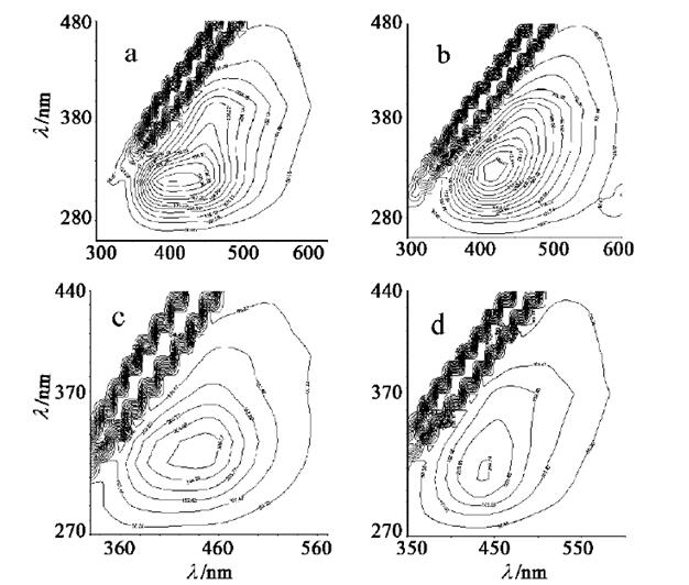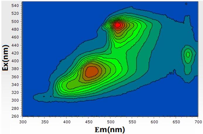 三維熒光光譜(EEMs)是將熒光強度以等高線方式投影在以激發(fā)光波長和發(fā)射光波長為縱橫坐標的平面上獲得的譜圖,圖像直觀,所含信息豐富。