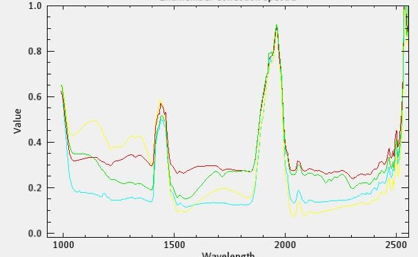 選取不同的目標(biāo)對象,獲取相應(yīng)的光譜,植被的光譜在680nm以后分反射率會提高,而非植被所表現(xiàn)出來的紅邊效應(yīng)與真實的植被的紅邊效應(yīng)有很大的差別。