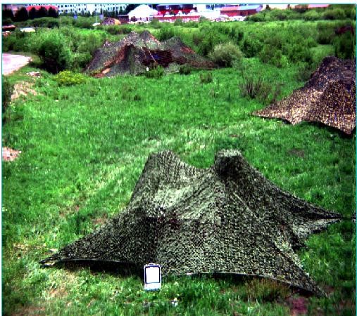 利用短波紅外相機對目標(biāo)進行拍攝,獲取到相應(yīng)的偽裝目標(biāo)圖像,如下圖所示,光譜范圍為1000nm-2500nm波段。紅圈標(biāo)注目標(biāo)為偽裝網(wǎng)。利用短波紅外波段的相機可以很直接的獲取到偽裝目標(biāo)的影像并與其它背景目標(biāo)區(qū)分開。