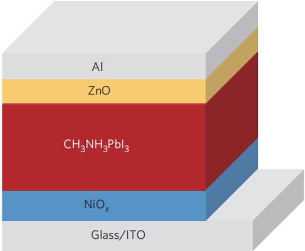 鈣鈦礦太陽能電池除兩端電極外,功能層分為空穴傳輸層(NiOx)、鈣鈦礦層(CH3NH3PbI3)以及電子傳輸層(ZnO)。太陽光從ITO玻璃面入射,電極在入射光背面,稱為背電極結(jié)構(gòu)。陰極為Al、陽極為ITO。