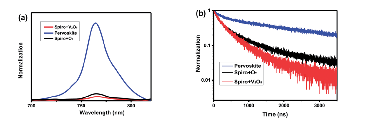 比如近期的在以釩氧化物為摻雜劑的高性能、穩(wěn)定的鈣鈦礦太陽能電池研究中(發(fā)表于J. Mater. Chem. A, 2019, 7, 13256–13264,DOI: 10.1039/c9ta03351c,華僑大學(xué),福建綠色功能材料工程研究中心&教育部環(huán)保功能材料工程研究中心的文章),不同摻雜劑下基于spiro-OMeTAD的鈣鈦礦太陽能電池的穩(wěn)態(tài)光致發(fā)光PL光譜的峰值大約在762nm,通過測試時(shí)間分辨光譜比較了空穴的復(fù)合萃取能力。使用雙指數(shù)擬合對(duì)數(shù)據(jù)處理中,短壽命組分和長壽命組分分別與非輻射復(fù)合以及整體性能相關(guān),原始的鈣鈦礦薄膜的PL 雙組分壽命分別為τ1=22.0 ns ,τ2 = 219.0ns, 而基于spiro-OMeTAD+V2O5 鈣鈦礦顯示了更短的壽命組分: τ1=8.6 ns ,τ2 = 41.0ns, 基于spiro-OMeTAD+O2 鈣鈦礦則為: τ1=19.6 ns ,τ2 = 70.5ns,由此得出結(jié)論:基于基于spiro-OMeTAD的V2O5 摻雜劑的鈣鈦礦展示了更快的更有效的空穴復(fù)合萃取能力。文章中的數(shù)據(jù)見下圖