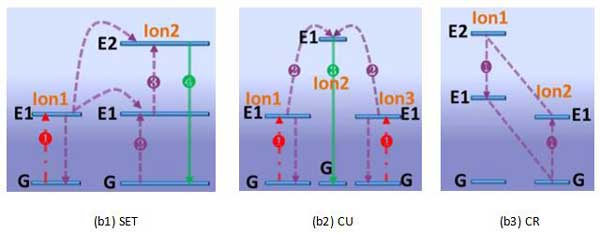 能量傳遞是指通過非輻射過程將兩個(gè)能量相近的激發(fā)態(tài)離子通過非輻射耦合,其中一個(gè)把能量轉(zhuǎn)移給另一個(gè)回到低能態(tài),另一個(gè)離子接受能量而躍遷到更高的能態(tài)。能量傳遞上轉(zhuǎn)換可以發(fā)生在同種離子之間,也可以發(fā)生在不同的離子之間。能量傳遞包含了連續(xù)能量傳遞(Successive Energy Transfer,SET)、合作上轉(zhuǎn)換(Cooperative Upconversion,CU)和交叉弛豫(Cross Relaxation,CR)三類。1
