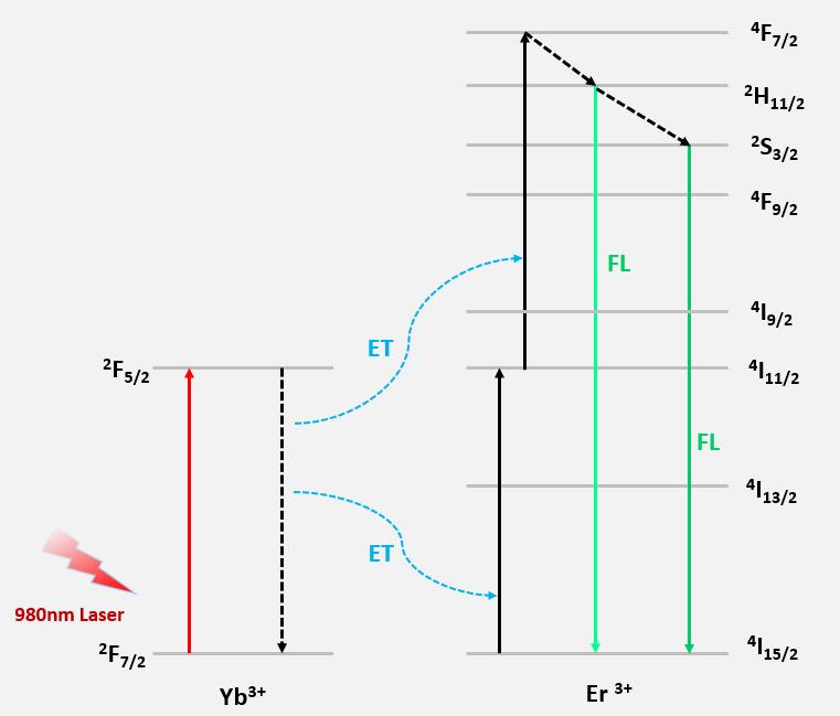為了分析NaYF4:YbEr的上轉換發(fā)光中的多光子吸收過程,提取NaYF4:YbEr的上轉換熒光光譜中位于521.5nm,539.5nm,541nm,546.5nm處的特征峰(圖2),作圖得到發(fā)光強度和激發(fā)功率的雙對數(shù)曲線。四條曲線的斜率約等于2,表征此樣品在這些波長為雙光子吸收過程。具體的過程為:Yb3+吸收一個980nm的光子后,從基態(tài)躍遷到激發(fā)態(tài),并將能量傳遞(ET)給Er3+,使之躍遷到激發(fā)態(tài),與此同時Yb3+回到基態(tài)并繼續(xù)吸收能量,處于激發(fā)態(tài)的Er3+繼續(xù)吸收Yb3+傳遞過來的能量發(fā)生更高能級的躍遷,*后以輻射躍遷的方式回到基態(tài),并釋放出特征綠光(圖3)。