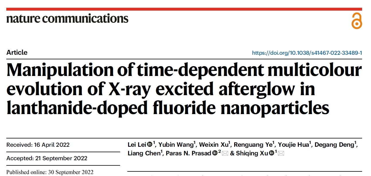 近日,中國計量大學(xué)光電學(xué)院徐時清教授團隊在時間維度的顏色演變研究領(lǐng)域取得重要進展,研究成果以“Manipulation of time-dependent multicolour evolution of X-ray excited afterglow in lanthanide-doped fluoride nanoparticles”為題發(fā)表在國際期刊Nature Communications (2022, 13: 5739)上,并被Nature Communications編輯選為Research Highlight重點推薦。中國計量大學(xué)雷磊副研究員為**作者,徐時清教授為通訊作者。