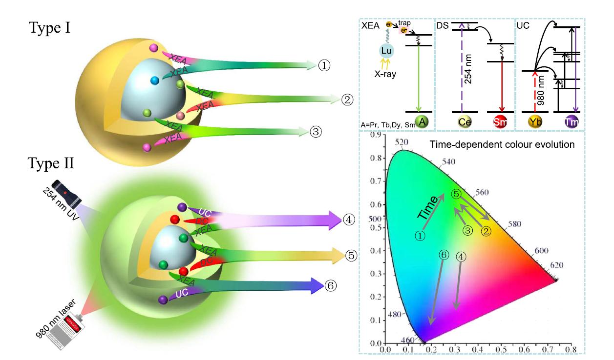 徐教授課題組報道了兩種通用方法對時間維度的多色體系演變進行調(diào)控。*一種是核@殼結(jié)構(gòu)的氟化物納米粒子,在受到X射線激發(fā)后,可形成時間依賴的余輝顏色演變過程(圖1中Type I)。另一種是核@殼@殼結(jié)構(gòu)的氟化物納米粒子,同時具備余輝、上轉(zhuǎn)換(UC)和下轉(zhuǎn)移(DS)的發(fā)光特點,能形成不同波長激發(fā)條件下的時間顏色演變(圖1 中Type II)。