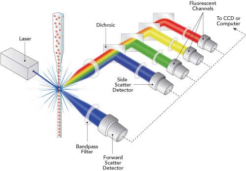 含有被標(biāo)記的細(xì)胞的懸浮液通過管道,一束固定的激光照射到液體上,當(dāng)每個(gè)懸浮顆粒通過光束時(shí)會(huì)將光散射,同時(shí)細(xì)胞所標(biāo)記的熒光化合物被激發(fā)并發(fā)射出頻率低于激發(fā)光的熒光,這些散射光和熒光的數(shù)據(jù)被瞄向這個(gè)點(diǎn)的檢測器記錄,通過線性或?qū)?shù)放大,由計(jì)算機(jī)分析出每個(gè)細(xì)胞的各種指標(biāo)。