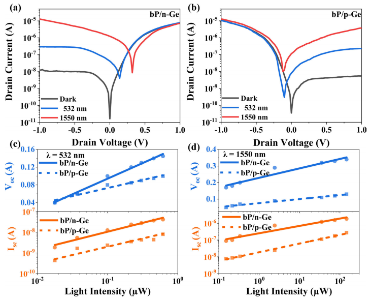 本文展示了黑磷/鍺異質結光二極管的光電性質。鍺的摻雜種類可以扭轉黑磷和鍺異質結二極管中所形成的整流方向。另外,黑磷/n型鍺的器件有顯著的光電效應,其*大開路電壓為0.34V,而這可使其成為自供能的光探測器。黑磷/鍺和黑磷/鍺異質結的器件對光的偏振也均是敏感的。綜上所述,黑磷和鍺異質結器件在多功能高效能光探測器領域可能會有極高的潛質。