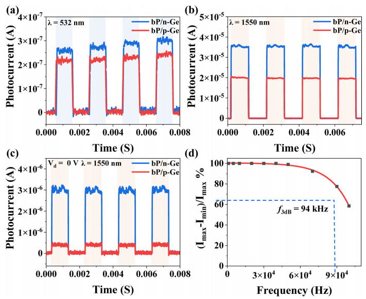 圖5. 在(a)532納米和(b)1550納米光照下,黑磷/鍺異質結的I-t圖像。(c)黑磷/鍺異質結在Vd=0V和1550納米光照射下的I-t圖像。(d)在1550納米光照射下[(Imax − Imin)/Imax]和轉化頻率的關系圖。