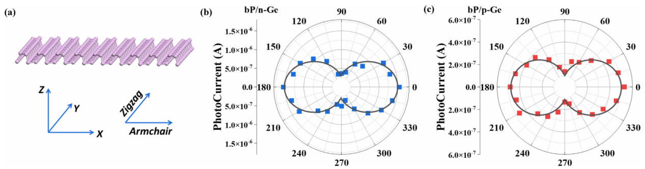 圖6. (a)黑磷的晶體結構。(b)黑磷/鍺和(c)黑磷/鍺異質結在1550納米光照射下光電流與光的偏振角之間的關系。