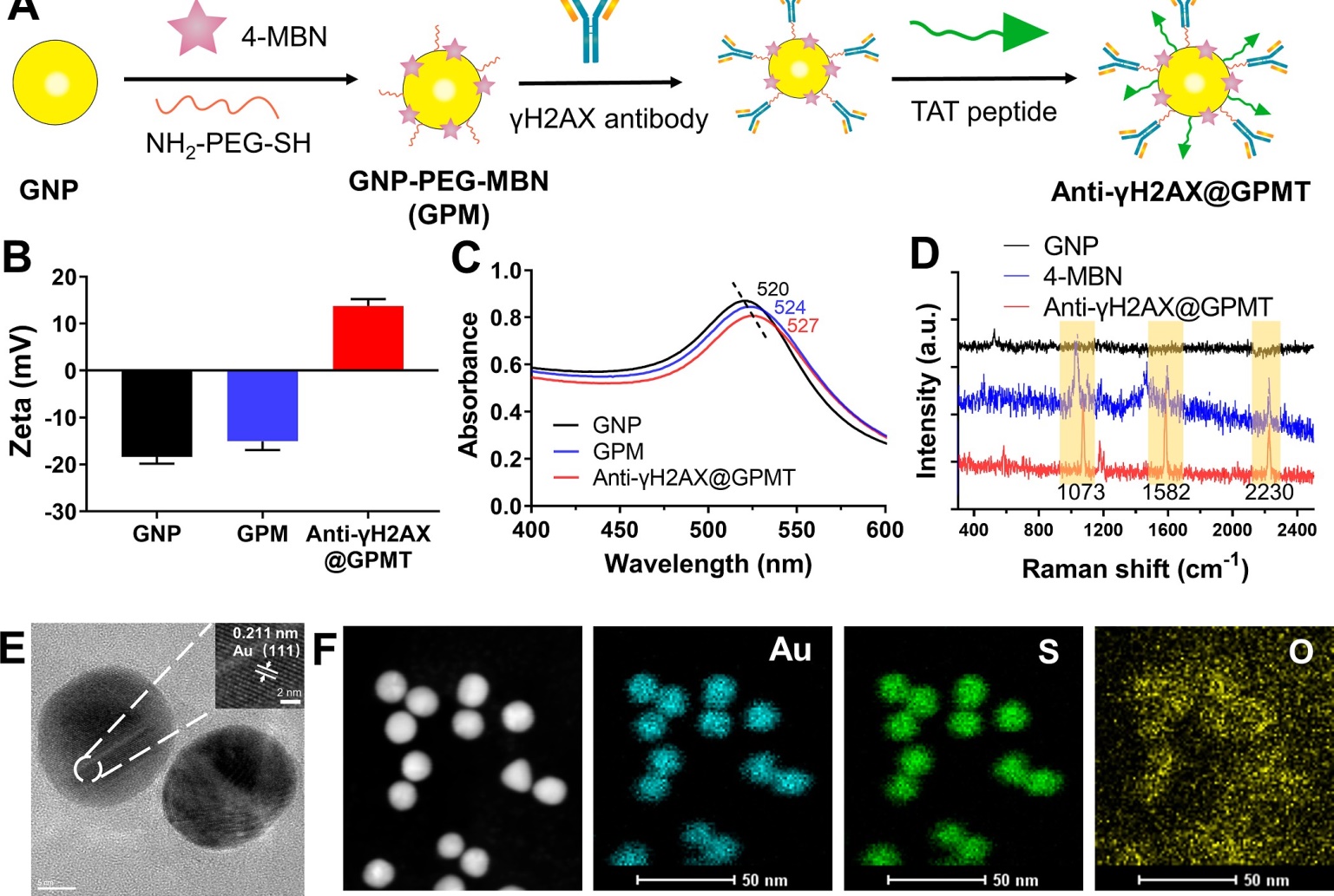 圖1 (A)抗-γH2AX@GPMT制備原理圖;(B) GNPs的ζ電勢圖;(C)不同GNPs紫外-可見光譜圖;(D)不同基質(zhì)拉曼光譜圖(1592cm-1和2230 cm-1是4-MBN特征峰);(E)抗-γH2AX@GPMT的TEM圖像;(F) anti-γH2AX@GPMT的EDX圖
