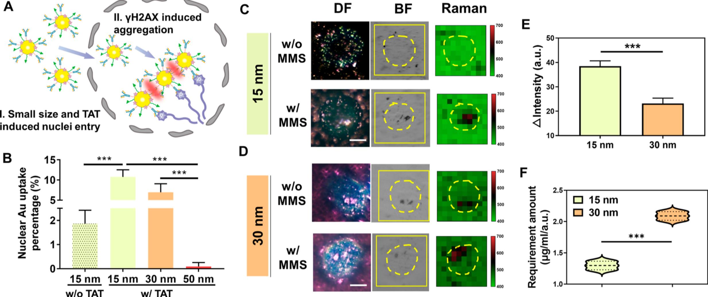 圖2 (A)抗-γH2AX@GPMT的檢測策略.(B)TAT修飾不同尺寸SERS基底Au尺寸分布(C)15nm抗-γH2AX@GPMT在2230 cm−1處的暗場、明場和拉曼光譜圖(D)30 nm抗-γH2AX@GPMT在2230 cm−1處的暗場、明場和拉曼光譜圖(E)MMS孵育前后SERS強(qiáng)度差值。(F)抗-γH2AX@GPMT的MMS平均需求量