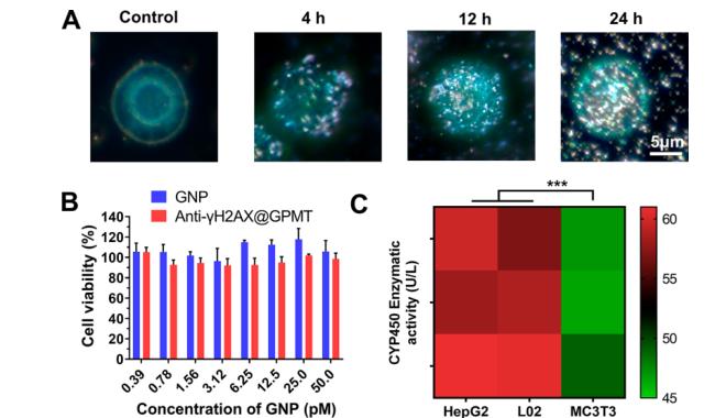 圖5 SERS傳感器優(yōu)化和表征。(A)不同時間下細(xì)胞攝取抗-γH2AX@GPMT顯微圖像(B) 加入GNP和抗-γH2AX@GPMT后L02細(xì)胞活性(C)不同傳感器的CYP450代謝酶活性。