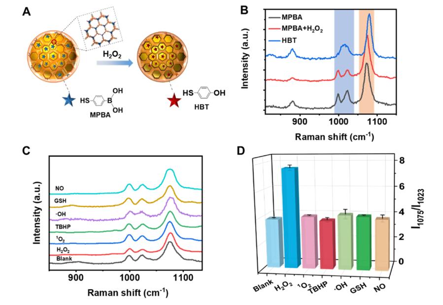 圖2(A)Au@COF/MPBA納米傳感器感應(yīng)機制。(B) MPBA、MPBA與H2O2和HBT的拉曼光譜。(C) Au@COF/MPBA被不同氧化后的拉曼光譜圖(D) Au@COF/MPBA被不同氧化后的I1075/I1023拉曼峰強度比,Au@COFn濃度為0.5 nM