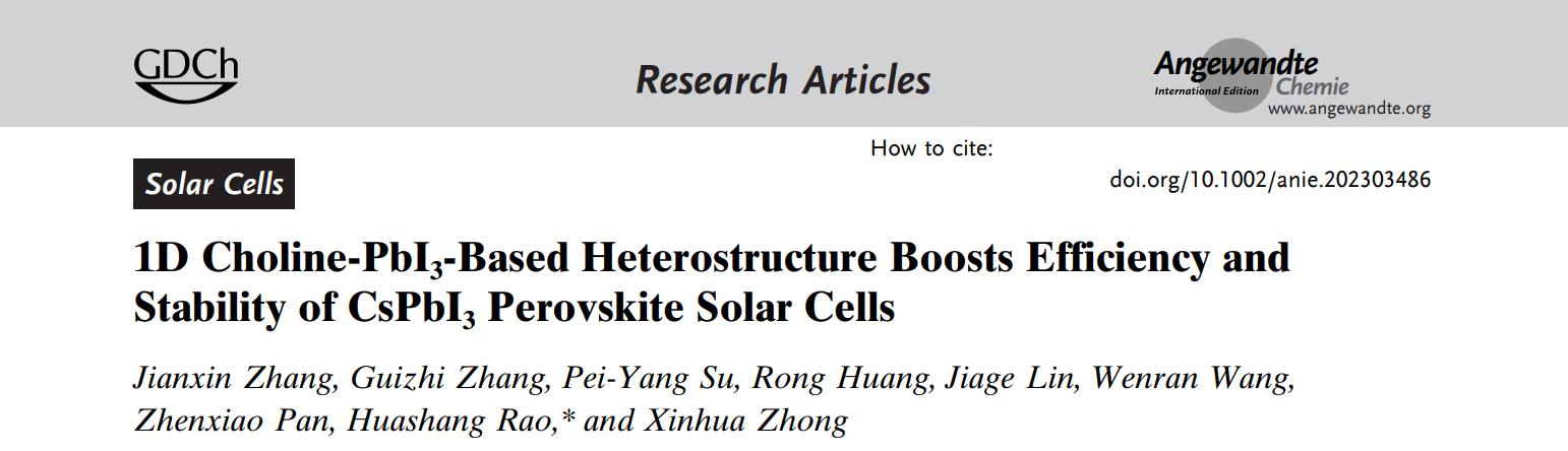 近日,華南農(nóng)業(yè)大學(xué)饒華商&鐘新華團(tuán)隊在碳基無機鈣鈦礦太陽電池上取得重要進(jìn)展,研究成果以“1D Choline-PbI3-Based Heterostructure Boosts Efficiency and Stability of CsPbI3 Perovskite Solar Cells”為題發(fā)表在國際 期刊Angewandte Chemie(DOI:10.1002/anie.202303486)上。華南農(nóng)業(yè)大學(xué)張鍵鑫博士生為*一作者,饒華商副教授為通訊作者。