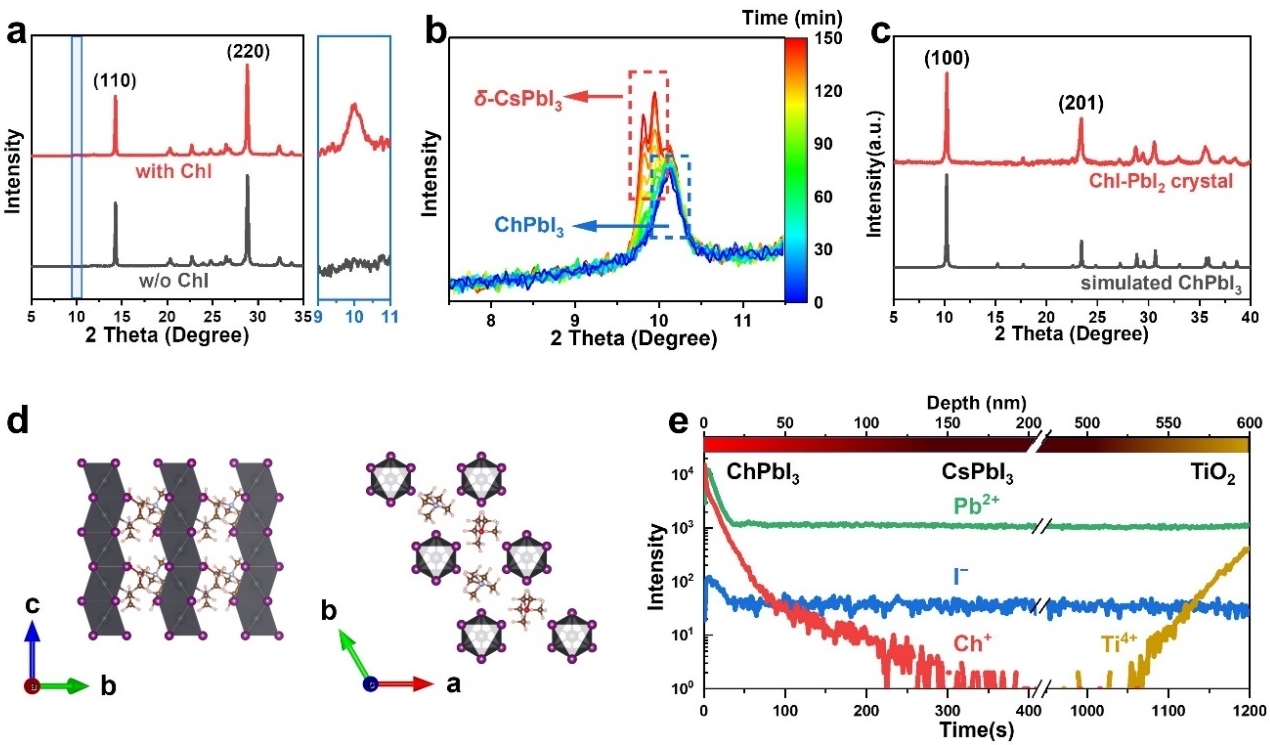 Figure 1. a) XRD patterns of CsPbI3 films without (w/o) and with ChI treatment. b) Temporal evolution of the suspicious peaks from XRD with ChI treatment under ambient atmosphere (RH = ~80%). c) XRD patterns of ChI-PbI2 crystal powder and simulated ChPbI3. d) Schematic crystal structure of hexagonal ChPbI3. e) ToF-SIMS depth profile of Ch+, Pb2+, I− and Ti4+ in CsPbI3/TiO2 film with ChI treatment.