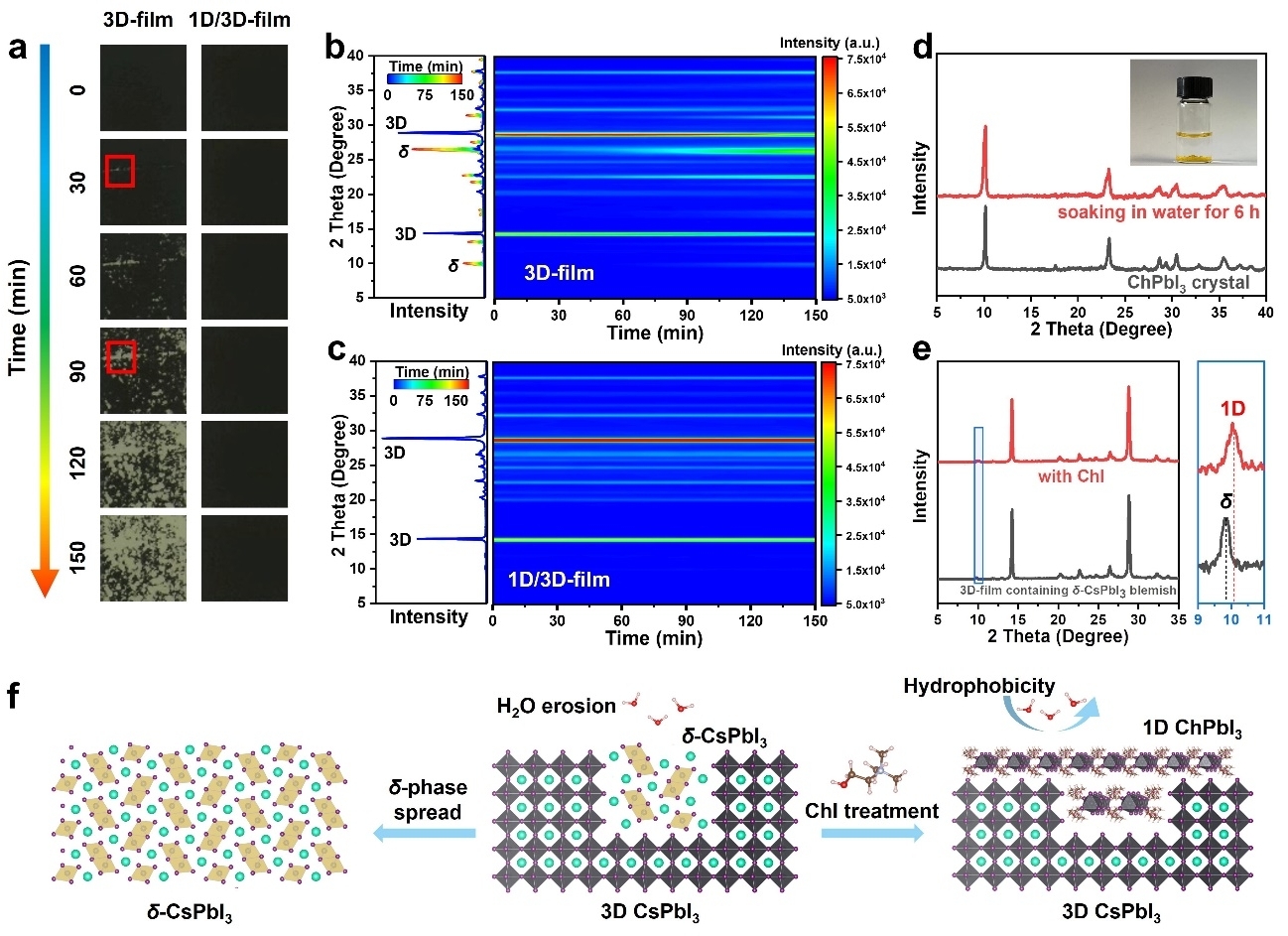 Figure 3. a) Photos showing color changes of 3D- and 1D/3D-film at RH=40~50% over time. Evolution of XRD patterns of b) 3D- and c) 1D/3D-film at RH=40~50% over time. The color bar on the left side represents time, and the color bar on the right side indicates the XRD intensity. d) XRD patterns of ChPbI3 crystals before and after soaking in water for 6 h. e) XRD patterns of 3D-film containing δ-CsPbI3 blemish before and after ChI treatment. f) Schematic illustration of inhibition of δ-phase by ChI treatment on CsPbI3 surface.