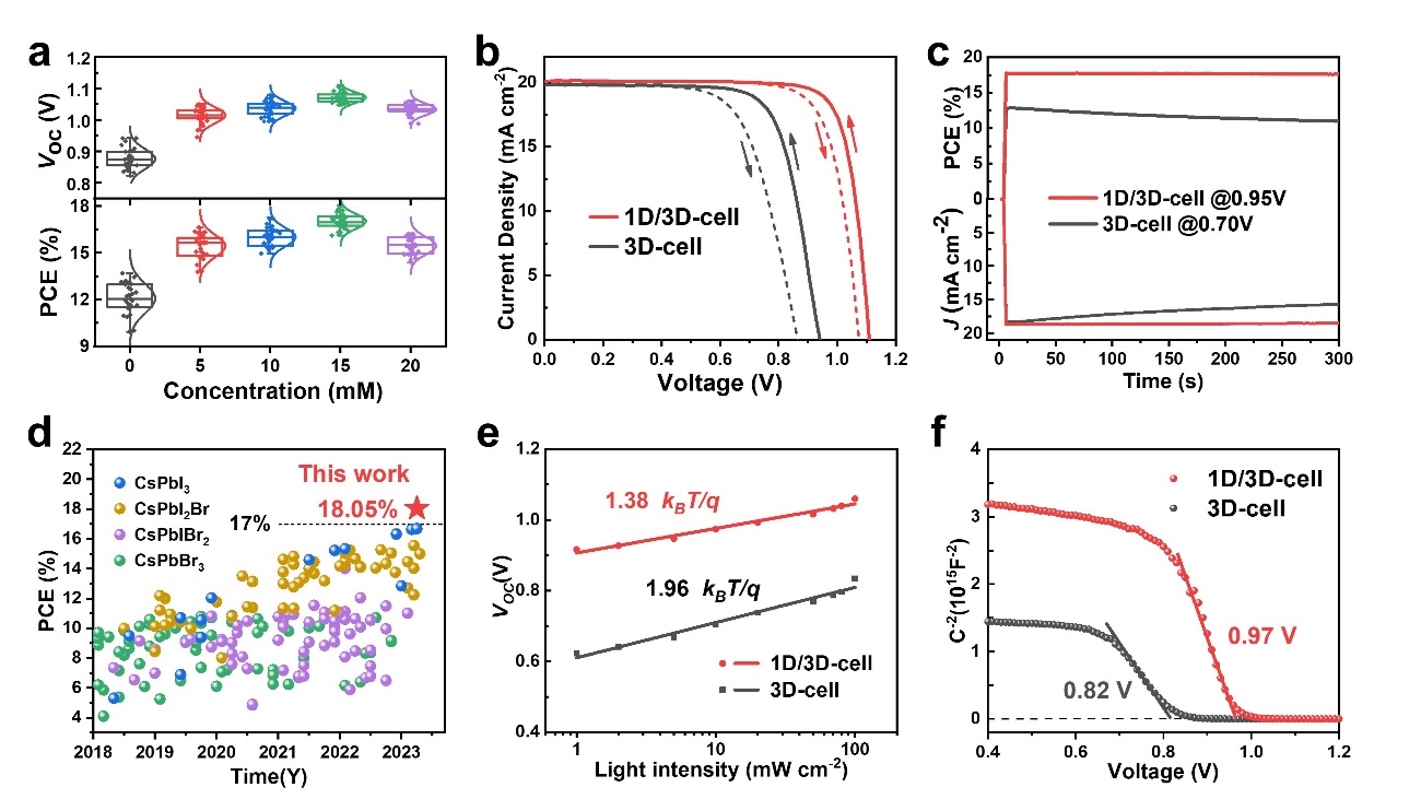 鑒于1D/3D結(jié)構(gòu)的構(gòu)建對CsPbI3薄膜缺陷態(tài)鈍化和穩(wěn)定性提高方面的作用,組裝的 CsPbI3 C-PSC的穩(wěn)定性顯著增強,器件的光電轉(zhuǎn)換效率從原始的13.69%提升至18.05%并獲得了17.8%的認(rèn)證效率,這是目前無空穴傳輸材料的碳基無機PSCs新的效率記錄(Figure 4d)。進(jìn)一步探究了Voc對入射光強度的依賴性,Mott-Schottky等測試,證明了ChI處理可以通過構(gòu)建1D ChPbI3/3D CsPbI3異質(zhì)結(jié)構(gòu),有效抑制器件中的非輻射復(fù)合,從而顯著提高Voc。(Figure 4)