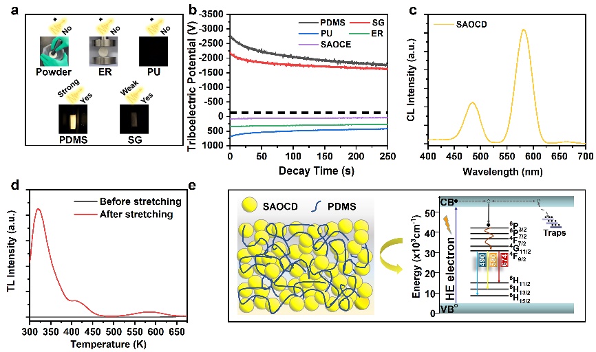 本工作通過將SAOCD (SAOCD) 粉末復合到PDMS基質中,創(chuàng)建了一種新型的力致發(fā)光材料,即自充能、可持續(xù)力致發(fā)光材料。無需任何預輻照,所制備的SAOCD/PDMS彈性體可以直接在力學刺激下表現出強烈且持久的力致發(fā)光,這極大地促進了其在力學照明、顯示、成像和可視化中的應用。通過研究基體效應以及熱釋光、陰極發(fā)光和摩擦電特性,界面摩擦起電誘導的電子轟擊過程被證明是機械刺激下SAOCD中自充能能量的原因?;讵毺氐淖猿潆娺^程,SAOCD/PDMS進一步展現出力學存儲和可視化讀取行為,為機械工程、生物工程和人工智能領域處理力學相關問題帶來了新穎的思路和方法。