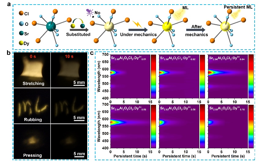 力致發(fā)光是指材料在力學刺激下產生的一種發(fā)光行為。由于其獨特的力學-光學響應特性,力致發(fā)光為實現力學傳感及其可視化提供了新思路和新途徑。目前發(fā)現的力致發(fā)光材料多數僅表現出動態(tài)力學刺激下的瞬態(tài)發(fā)射行為,極大地限制了其在力學的可視化顯示和成像方面的應用??沙掷m(xù)力致發(fā)光材料能夠在力學刺激停止后繼續(xù)保持發(fā)光行為,對可持續(xù)力致發(fā)光材料的開發(fā)是應對上述問題的有效方式。此前,研究人員通過陷阱工程設計,在特定材料體系中獲得了力學刺激后可持續(xù)的力致發(fā)光現象。然而,該類可持續(xù)力致發(fā)光材料在使用前必須經歷預輻照,在其結構內部預先儲存能量,這不僅增加了實際應用時操作的難度,也難以實現該類材料的循環(huán)穩(wěn)定使用。因此,實現無需預輻照的自充能、可持續(xù)力致發(fā)光成為當前研究的熱點之一。