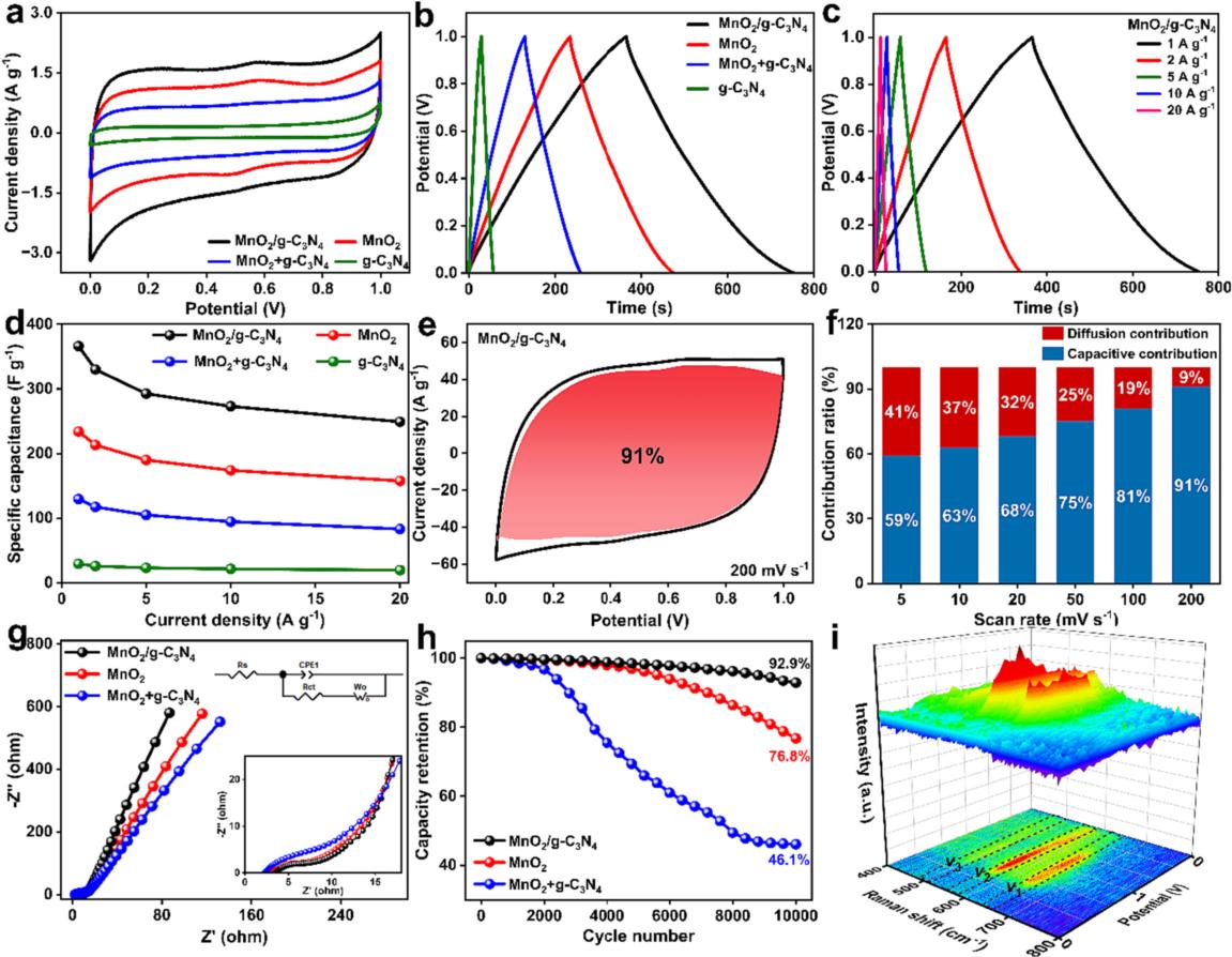 電化學測試結果如圖3所示。a)循環(huán)伏安(CV)曲線顯示,四種樣品均呈準矩形形狀,其中MnO2和MnO2/g-C3N4明顯呈現(xiàn)出清晰的氧化還原峰。圖3b,c的恒流充放電(GCD)曲線可以看出,四個樣品的GCD曲線都呈現(xiàn)出近似對稱的三角形。基于GCD曲線,計算了不同電流密度下的比電容,所得結果如圖3d所示。電容控制百分比情況如圖3f所示,電容控制的MnO2/g-C3N4的大百分比表明了MnO2/g-C3N4促進離子轉移的特征。圖3g等效電路對電化學阻抗譜(EIS)數(shù)據(jù)表明不同材料之間的Rs存在差異,這可能是由于電極材料與集流器之間不可避免的系統(tǒng)接觸不良造成的。循環(huán)性能如圖3h。