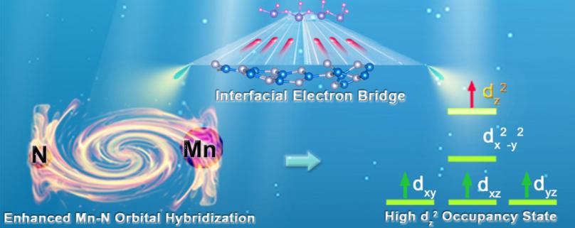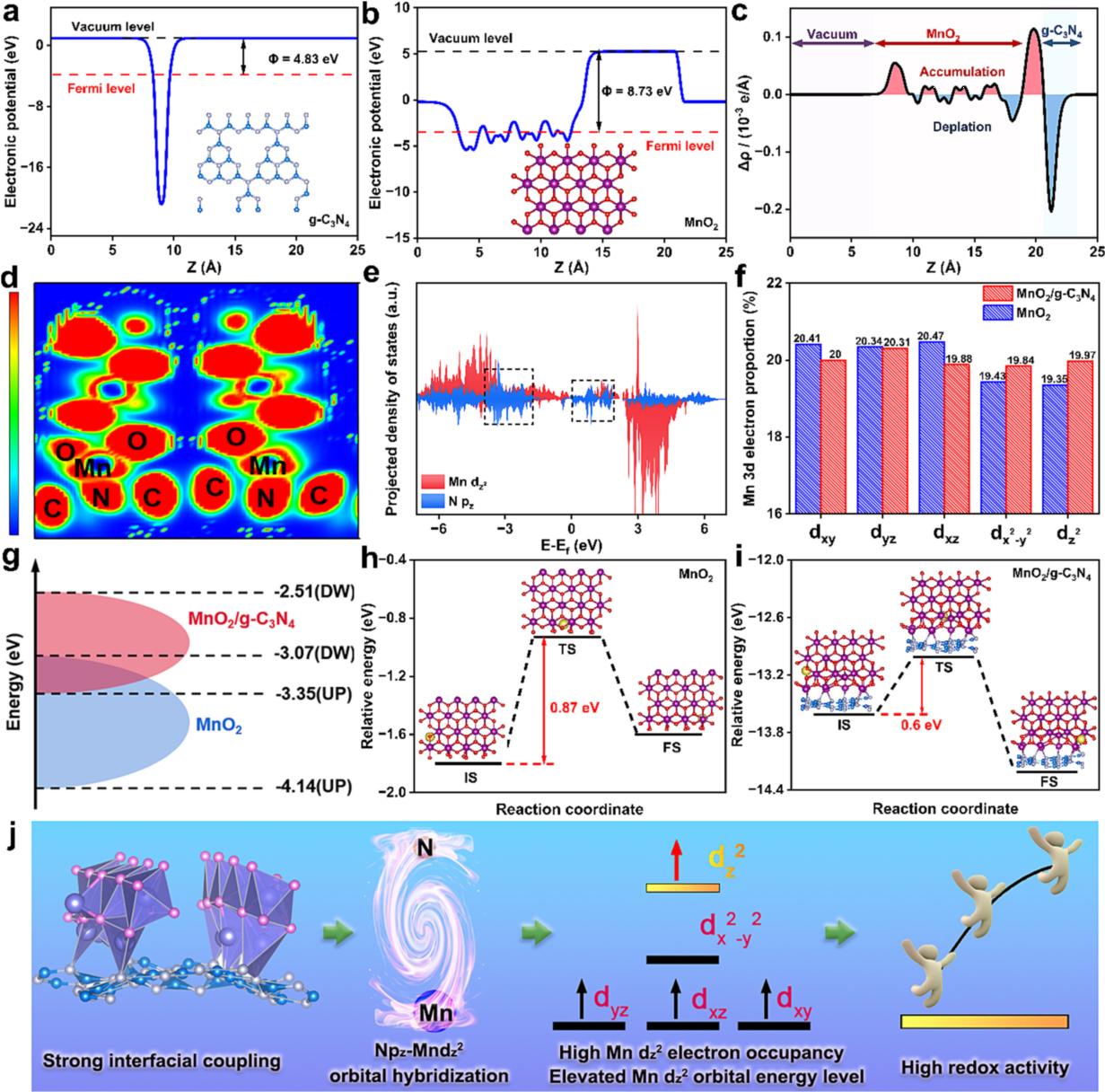 圖2 a-c) XPS圖證明, MnO2/g-C3N4中N 1s結合能的藍移和Mn 2p結合能的紅移證實了電子從g-C3N4向MnO2遷移。;d-e) sXAS圖證明了Mn-N鍵引入后,Mn與O配位的eg軌道發(fā)生了變化,MnO2/g-C3N4的dz2電子占據(jù)(50.06%)高于MnO2(29.14%)。紫外光電子能譜(UPS)結果如圖2f所示,g-C3N4的功函數(shù)低于MnO2的功函數(shù),說明電子從g-C3N4向MnO2遷移。此外,與MnO2相比,MnO2/g-C3N4的功函數(shù)更低,為5.14eV,表明電子轉移特征增強。圖2g提供了MnO2/g-C3N4中電子遷移現(xiàn)象的可視化表示,當g-C3N4引入到MnO2框架中時,由于g-C3N4和MnO2各自的功函數(shù)不同,導致電子從g-C3N4向MnO2遷移。