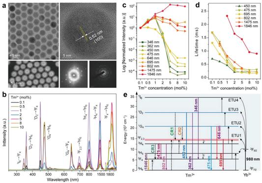 圖2. 樣品表征和發(fā)光性能:a) 樣品表征;b)不同Tm3+濃度摻雜樣品的發(fā)光光譜;c,d)發(fā)光強(qiáng)度和壽命變化;e) Tm3+離子之間的部分交叉弛豫過程。