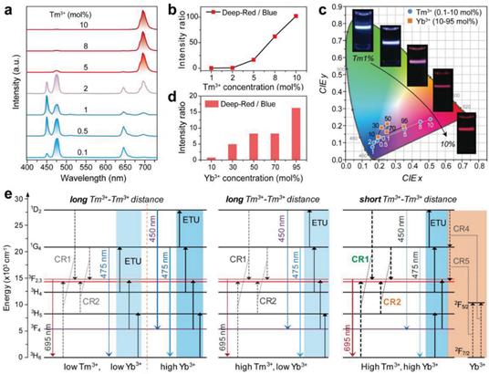 圖3. 穩(wěn)態(tài)激發(fā)的光色調(diào)控:a,b) Tm3+濃度摻雜樣品980 nm穩(wěn)態(tài)激發(fā)的發(fā)射光譜及紅-藍(lán)比變化規(guī)律;c)不同摻雜濃度樣品發(fā)光對應(yīng)的CIE坐標(biāo)值和發(fā)光照片;d) Yb3+濃度摻雜樣品的紅-藍(lán)比;e)不同摻雜濃度時(shí)的發(fā)光和交叉弛豫示意圖。