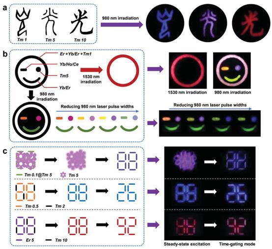 圖5. 前沿應(yīng)用:a)穩(wěn)態(tài)防偽演示;b)脈沖激發(fā)的多模式防偽;c)時(shí)域信息存儲。