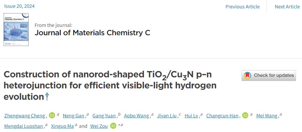 針對(duì)上述科學(xué)問(wèn)題,湖北工業(yè)大學(xué)理學(xué)院(芯片產(chǎn)業(yè)學(xué)院)程正旺等提出了一種基于匹配帶隙和功函數(shù)的p-n異質(zhì)結(jié),不僅促進(jìn)了可見(jiàn)光吸收,還極大地提高了光生載流子的分離與遷移效率,實(shí)現(xiàn)了高效、穩(wěn)定的PEC可見(jiàn)光析氫。該工作以“Construction of nanorod-shaped TiO2/Cu3N p–n heterojunction for efficient visible-light hydrogen evolution”為題發(fā)表在國(guó)際期刊Journal of Materials Chemistry C上。