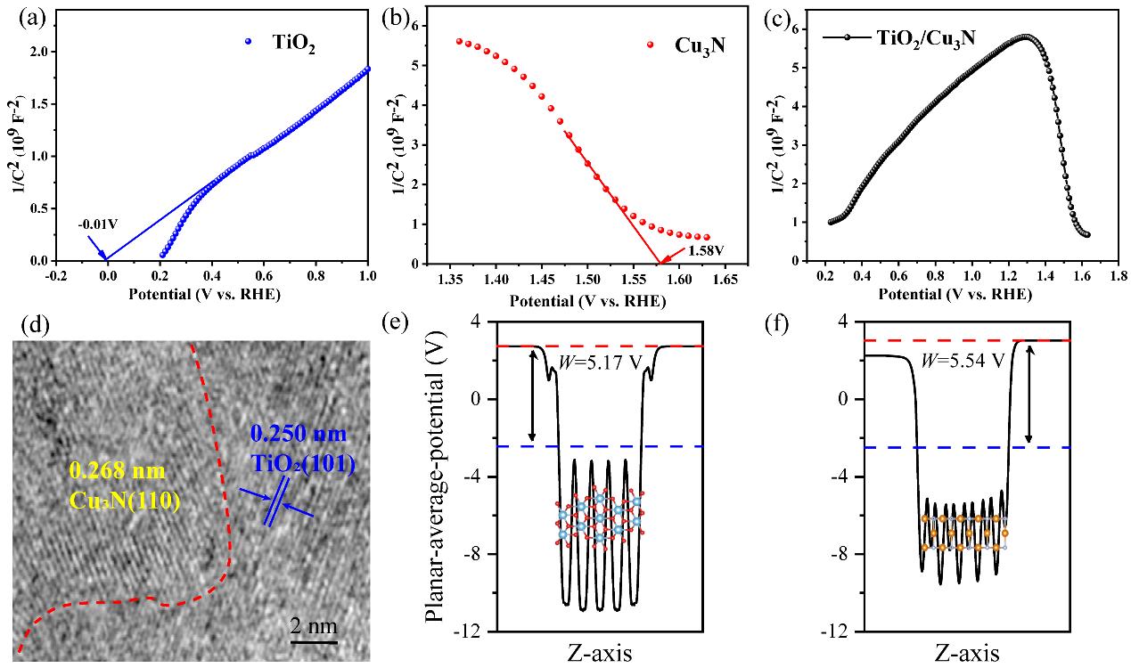 圖3. TiO2 (a),Cu3N (b)和TiO2/Cu3N的莫特-肖特基曲線(MS);TiO2/Cu3N界面的TEM圖像;理論計(jì)算的平面平均電勢(shì),(e) TiO2(101),(f) Cu3N(110)。
