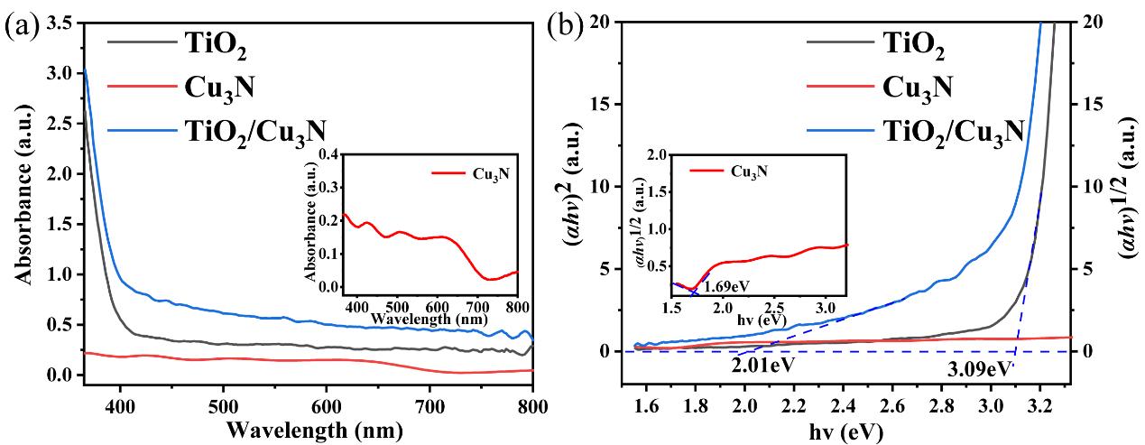 圖4. 直接帶隙TiO2、TiO2/Cu3N ((αhν)2~hν)和間接帶隙Cu3N ((αhν)1/2~hν)的紫外-可見(jiàn)漫反射光譜(DRS) (a)和相應(yīng)的Tauc圖(b)。