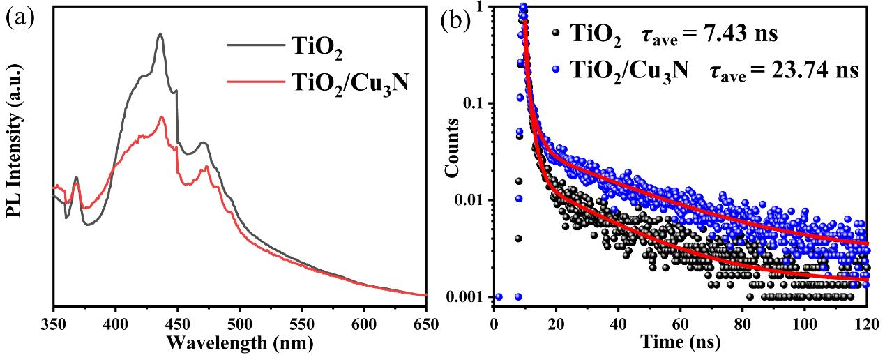 程正旺等采用磁控濺射法,將p型Cu3N薄膜沉積到一維 n型TiO2納米陣列上,形成了TiO2/Cu3N p-n異質(zhì)結(jié)。得益于合適的能隙和內(nèi)建電場(chǎng)的協(xié)同作用,形成的TiO2/Cu3N p-n異質(zhì)結(jié)不僅將帶隙從TiO2的3.09 eV減小到TiO2/Cu3N的2.01 eV,光響應(yīng)范圍也從從紫外區(qū)擴(kuò)展到可見(jiàn)光區(qū)域。此外,光生電子-空穴對(duì)的分離和轉(zhuǎn)移效率明顯改善,平均載流子壽命延長(zhǎng)了3倍。進(jìn)一步地,在> 420 nm可見(jiàn)光照射和-0.97 V vs. RHE(可逆氫電極)條件下,光電流密度從TiO2的-0.33 mA/cm2提高到TiO2/Cu3N的-4.66 mA/cm2,提高了約14.12倍。此外,構(gòu)建的TiO2/Cu3N異質(zhì)結(jié)表現(xiàn)出穩(wěn)定的PEC析氫性能,相應(yīng)的可見(jiàn)光分解水產(chǎn)氫速率達(dá)到6.98 µmol/cm²/h。以上結(jié)果表明:構(gòu)建具有合適帶隙和功函數(shù)的p-n異質(zhì)結(jié)是提高TiO2光電催化性能的一種有效途徑,并且有望應(yīng)用于其他光電催化劑。本項(xiàng)研究為設(shè)計(jì)和制備高效、低成本、無(wú)毒的PEC分解水電極和其他光電子化學(xué)應(yīng)用提供了一條有效的途徑。