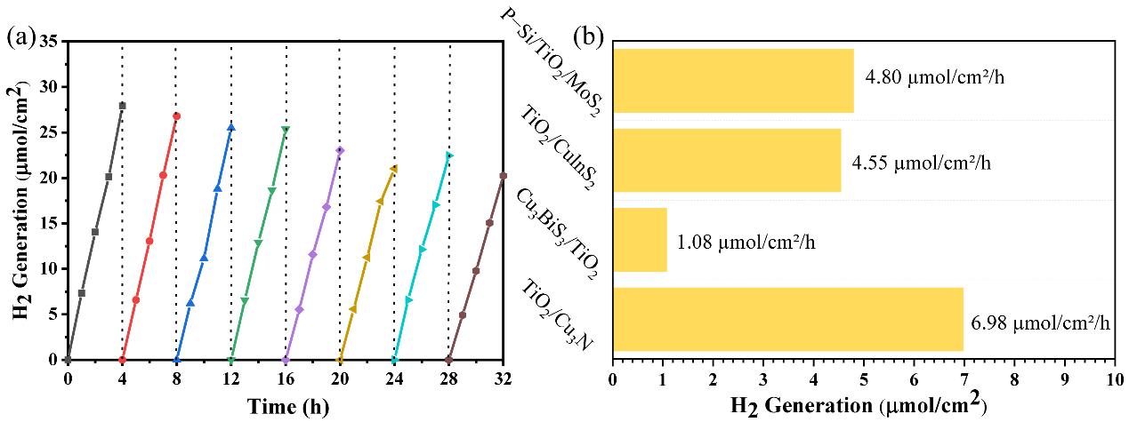 圖7. (a) TiO2/Cu3N在> 420 nm可見(jiàn)光照射下PEC產(chǎn)氫H2的循環(huán)穩(wěn)定性。(b)本研究中TiO2/Cu3N的平均產(chǎn)氫速率與報(bào)道的TiO2基異質(zhì)結(jié)結(jié)果的比較。