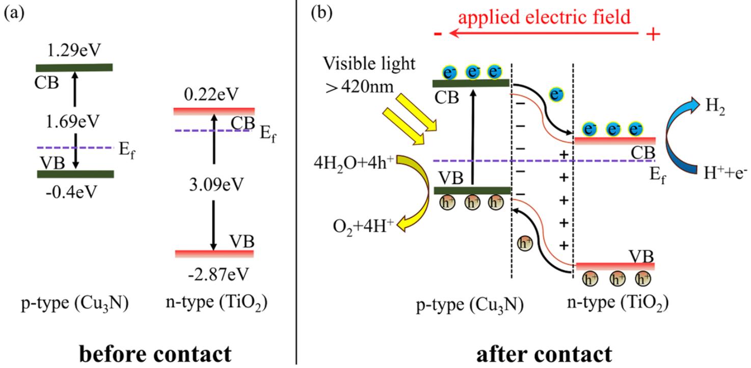 圖8. > 420 nm可見(jiàn)光照射下,TiO2/Cu3N p-n異質(zhì)結(jié)的光生載流子遷移與光電催化分解水析氫機(jī)理圖。