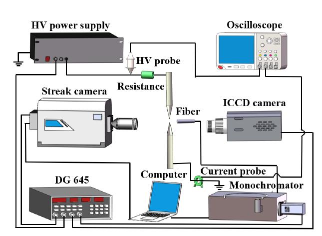實驗裝置圖如下圖所示,放電電極由兩根鎢針組成,電極間隙控制在2mm,火花放電由納秒脈沖電源驅(qū)動產(chǎn)生。利用DG645同步納秒脈沖電源、條紋相機以及ICCD相機捕獲火花放電超快擊穿過程以及放電模式演化過程的圖像,同時,利用DG645同步納秒脈沖電源以及發(fā)射光譜儀完成對放電過程中產(chǎn)生的活性粒子的產(chǎn)生和淬滅過程的診斷。。