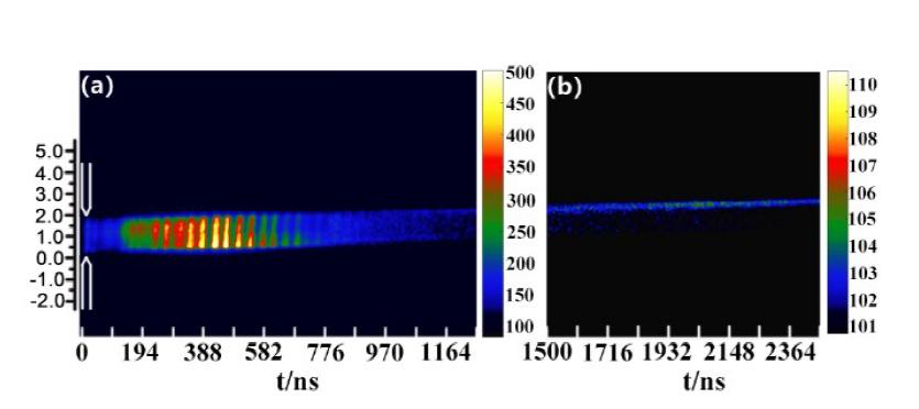 由于初始擊穿過程和流光到火花階段的轉(zhuǎn)換過程通常在幾納秒的時間尺度內(nèi)完成,ICCD相機難以捕捉到其中變化,因此需要使用分辨率更高的條紋相機,圖3-4為條紋相機采集到的火花放電過程圖像,采集的時間窗口分別設(shè)置為980ns(Δ t=9.8ns)以及10 ns(Δ t=9100 ps)。從圖3中可以發(fā)現(xiàn),在形成放電通道的初期,靠近負極的放電發(fā)光更強。而在形成放電通道之后,正極附近的放電更強一些。1500ns之后,火花放電通道熄滅,而在負極附近仍然可以觀察到放電等離子體的余輝。