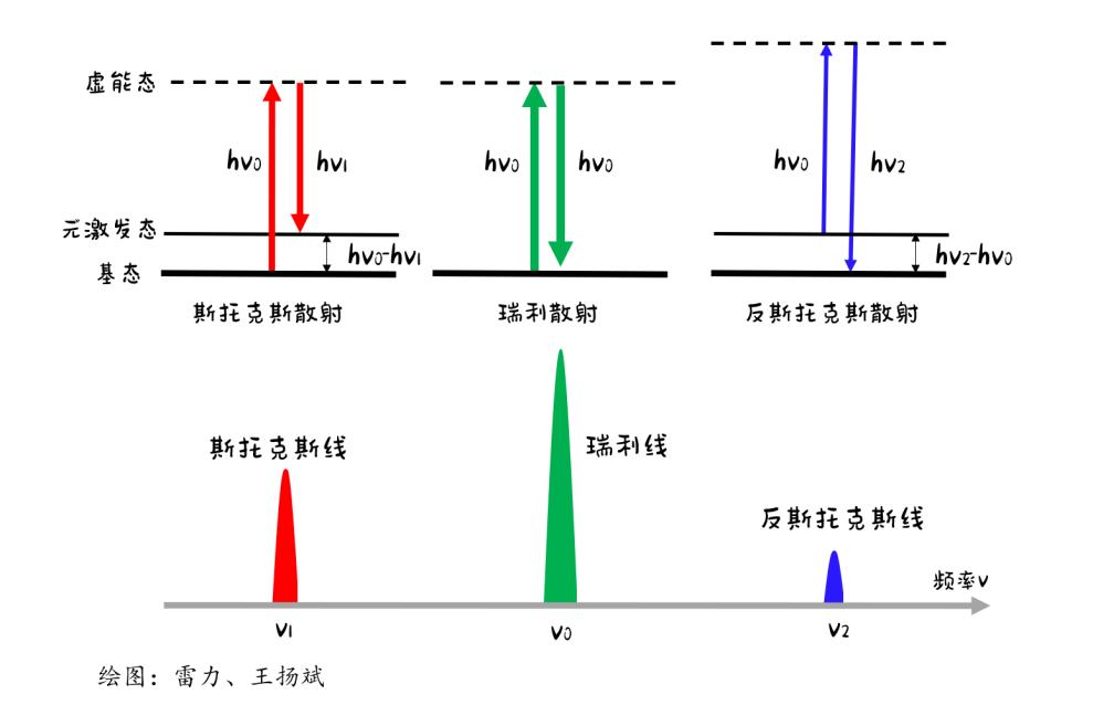 在光與物質(zhì)相互作用過程中,拉曼散射光與入射光的頻率差(拉曼頻移)反映物質(zhì)的固有屬性,可以根據(jù)拉曼頻移的大小來研究物質(zhì)的結(jié)構(gòu)與物性。值得注意的是,拉曼散射現(xiàn)象和熒光現(xiàn)象物理的機(jī)制不同,拉曼效應(yīng)不能用實(shí)際電子能級(jí)躍遷來解釋,而用元激發(fā)的虛能級(jí)躍遷來說明。拉曼散射過程中,如果散射光子的能量小于入射光子的能量(hv1<hv0),稱之為斯托克斯散射;如果散射光子的能量大于入射光子的能量(hv1>hv0),稱之為反斯托克斯散射。在一次常規(guī)的拉曼散射物理過程中,正、反斯托克斯散射會(huì)同時(shí)發(fā)生,由于基態(tài)和激發(fā)態(tài)的相對(duì)熱占比遵循玻爾茲曼分布,室溫條件下正斯托克斯譜線的強(qiáng)度要高于反斯托克斯譜線的強(qiáng)度(Is>Ias),在實(shí)驗(yàn)上可以通過測量正、反斯托克斯散射譜線強(qiáng)度比來推測物質(zhì)的溫度。