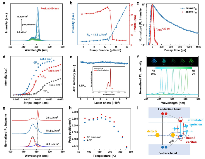 鈣鈦礦薄膜實現(xiàn)藍(lán)色激光仍十分困難,葉院士團(tuán)隊針對這一難題,提出了一種缺陷工程策略,通過辛基溴化銨(OABr)添加劑在全無機Rb/Cs混合鈣鈦礦薄膜中引入深能級缺陷,并基于該缺陷形成束縛激子,*終基于束縛激子在高缺陷密度的鈣鈦礦薄膜中實現(xiàn)了高性能的藍(lán)光放大自發(fā)輻射(ASE),閾值低至13.5 μJ/cm2,凈增益系數(shù)高達(dá)744.7 cm-1。在高性能鈣鈦礦薄膜增益介質(zhì)的基礎(chǔ)上,進(jìn)一步構(gòu)筑垂直腔面發(fā)射激光器并實現(xiàn)了482 nm的單縱模藍(lán)色激光。這項工作不僅展示了一種制備高性能鈣鈦礦藍(lán)色激光增益介質(zhì)的簡便方法,同時也提出了一種基于束縛激子實現(xiàn)受激輻射的機制,證實了缺陷可以被有效利用,為實現(xiàn)高性能藍(lán)色激光提供了新的思路。