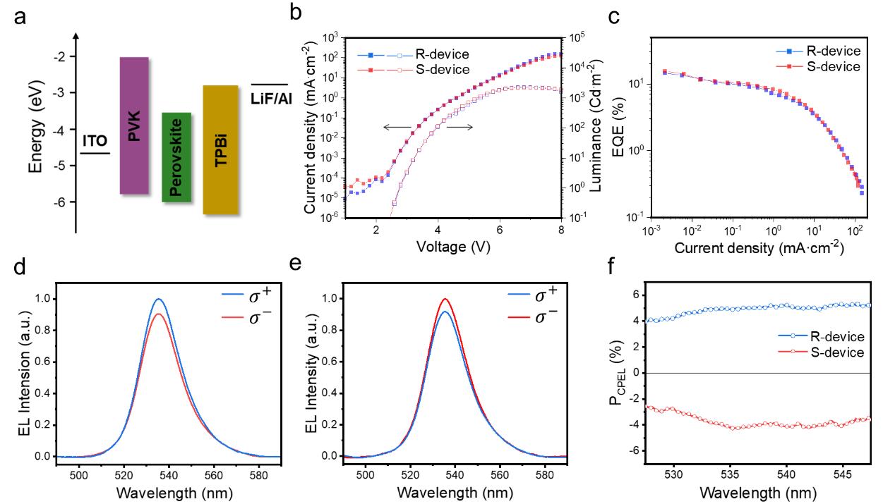 近年來,可溶液加工的手性金屬鹵化物鈣鈦礦在室溫條件下展現(xiàn)出優(yōu)異的手性誘導(dǎo)自旋選擇性(CISS)而備受關(guān)注。通過這種特性,緊湊的LED器件也能夠直接操縱注入電子的自旋態(tài),實(shí)現(xiàn)高效的圓偏振電致發(fā)光(CP-EL)。該技術(shù)在3D顯示、虛擬現(xiàn)實(shí)技術(shù)等領(lǐng)域有潛在的應(yīng)用。然而,目前基于手性鈣鈦礦的自旋發(fā)光二極管中實(shí)現(xiàn)高外量子效率(EQE)和高CP-EL仍然是一個(gè)重要挑戰(zhàn)。
