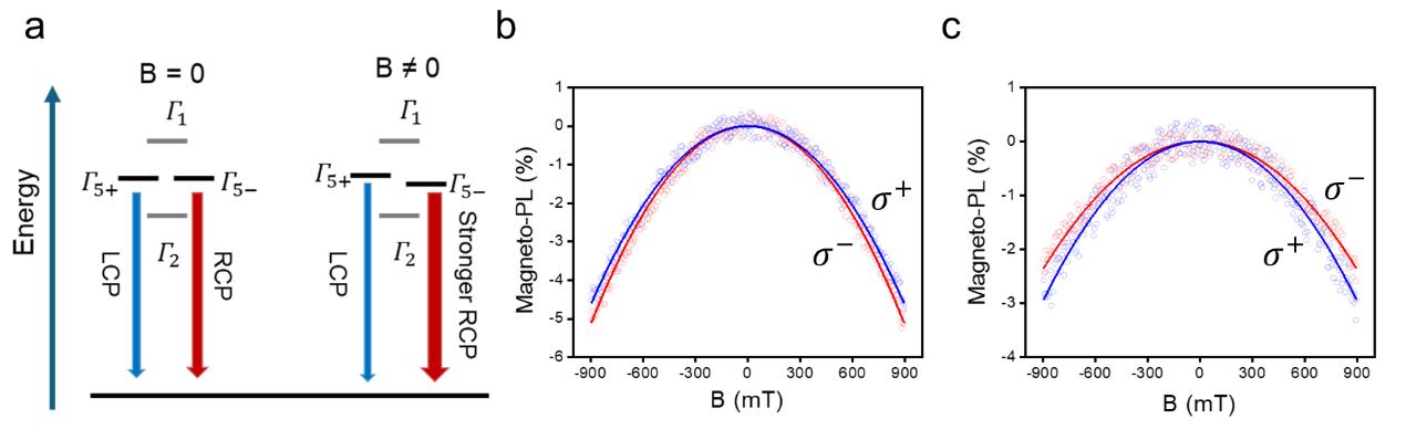 同時(shí)該團(tuán)隊(duì)通過磁場(chǎng)依賴光譜和自旋軌道理論的結(jié)合,進(jìn)一步量化了手性鈣鈦礦(R/S-MBA?FA?Pb?Br??)中的自旋行為,結(jié)果表明材料的載流子自旋壽命達(dá)20 ps。磁場(chǎng)作用下,自旋注入與產(chǎn)生的圓偏振發(fā)射之間呈現(xiàn)直接相關(guān)關(guān)系。