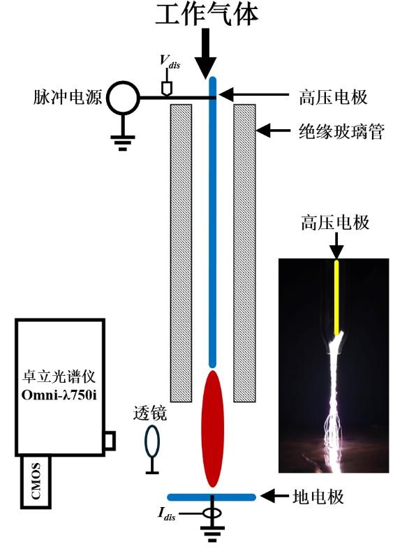 大氣壓低溫等離子體射流實(shí)驗(yàn)裝置由高壓脈沖電源、等離子體射流發(fā)生器、卓立發(fā)射光譜測(cè)量系統(tǒng)、電參數(shù)測(cè)量系統(tǒng)和供氣系統(tǒng)構(gòu)成,如圖1所示。高壓電極放置在單端封口的石英玻璃管中,其底端距離地電極20mm。高壓脈沖電壓峰值14kV,頻率2kHz,脈寬500ns。工作氣體為氬氣,流速2.5L/min。卓立發(fā)射光譜測(cè)量系統(tǒng)由卓立Omni-λ750i光譜儀與科學(xué)級(jí)像增強(qiáng)型相機(jī)IsCMOS構(gòu)成,IsCMOS相機(jī)也可單獨(dú)連接鏡頭做像增強(qiáng)高速相機(jī)使用,如圖2所示。