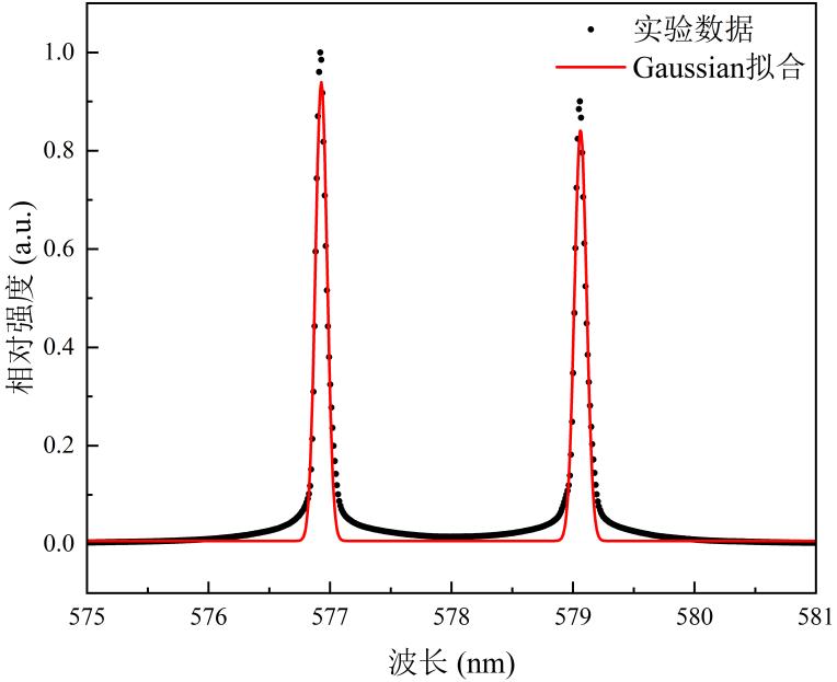 儀器展寬(ΔλI)測(cè)量擬合光譜如圖6所示。在實(shí)驗(yàn)條件下測(cè)定低壓汞燈在577nm與579nm處的特征譜線,經(jīng)過Gaussian擬合,得到儀器展寬ΔλI=0.1150nm。