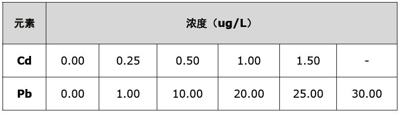 按下表配制各元素的系列標(biāo)準(zhǔn)溶液,待儀器工作穩(wěn)定后,依次進(jìn)樣,根據(jù)濃度和吸光度,繪制標(biāo)準(zhǔn)曲線。