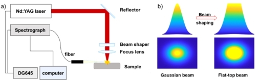 在優(yōu)化激光等離子體激發(fā)條件方面,華中科技大學(xué)武漢光電國(guó)家研究中心的李青洲等[7]采用激光誘導(dǎo)擊穿光譜結(jié)合激光誘導(dǎo)熒光(Laser-Induced Breakdown Spectroscopy combined with Laser-Induced Fluorescence, LIBS-LIF)提高鈾礦石中的鈾特征譜線強(qiáng)度;研究結(jié)果表明,與僅采用LIPS技術(shù)相比,采用LIBS-LIF技術(shù)后U II 409.01 nm特征譜線強(qiáng)度提升21.3倍,鈾元素檢出限(LoD)由199 ppm下降至35 ppm。清華大學(xué)姬建訓(xùn)等[8]通過(guò)將入射激光整形為平頂光束,有效改善了激光強(qiáng)度的空間分布,降低了激光與等離子體作用過(guò)程中的等離子體屏蔽效應(yīng),提高了等離子體輻射光譜強(qiáng)度。實(shí)驗(yàn)裝置和光束整形如圖4所示,研究結(jié)果表明,光束整形后,鈾礦石中鈾元素特征譜線U II 409.013 nm強(qiáng)度提升約5倍,鈾元素檢出限達(dá)到21.2 ppm。中國(guó)原子能科學(xué)研究院高智星等[9]研發(fā)的背負(fù)式LIPS裝置通過(guò)提升激光-等離子體閃光傳輸效率,將鈾礦石中鈾元素的檢出限降低至18 ppm。激光等離子體激發(fā)條件的優(yōu)化僅需對(duì)裝置硬件進(jìn)行簡(jiǎn)單改進(jìn)即可有效改善LIPS探測(cè)限,無(wú)需進(jìn)行樣品前處理,時(shí)效性好,適用于鈾礦石的原位、現(xiàn)場(chǎng)、快速分析。