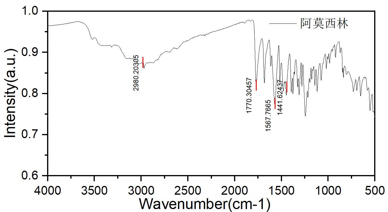 如上所示為實驗室測得四種抗生素的紅外光譜圖,分別與標準光譜圖保持一致[2]。其中,阿莫西林有明顯的取代苯類骨架振動峰(1567cm-1、1441cm-1)。另外,阿莫西林和頭孢同屬于β-內(nèi)酰胺類抗生素,它們的化學(xué)結(jié)構(gòu)中都含有內(nèi)酰胺環(huán),都存在β-內(nèi)酰胺環(huán)羰基的伸縮振動峰(1750~1800cm-1),以及明顯的C-H伸縮振動(3000~2843cm-1,2972~2843cm-1)。對乙酰苯酚有酮類C=O鍵的伸縮振動峰(如1639cm-1),還有明顯的苯環(huán)的骨架振動(如1600cm-1、1500cm-1)以及O-H鍵面外彎曲振動(677cm-1)。地塞米松除了羧酸的OH伸縮振動(3300-2500cm-1)、C=O伸縮振動(如1615cm-1)、OH面外彎曲振動(900cm-1),還有酮類C=O伸縮振動(1615cm-1)等。