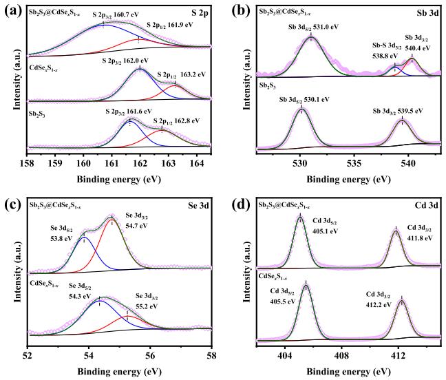 圖2 (a) S 2p,(b) Sb 3d,(c) Se 3d和(d) Cd 3d的高分辨率XPS光譜,分別對應(yīng)于Sb2S3、CdSexS1-x和Sb2S3@CdSexS1-x光電極。
