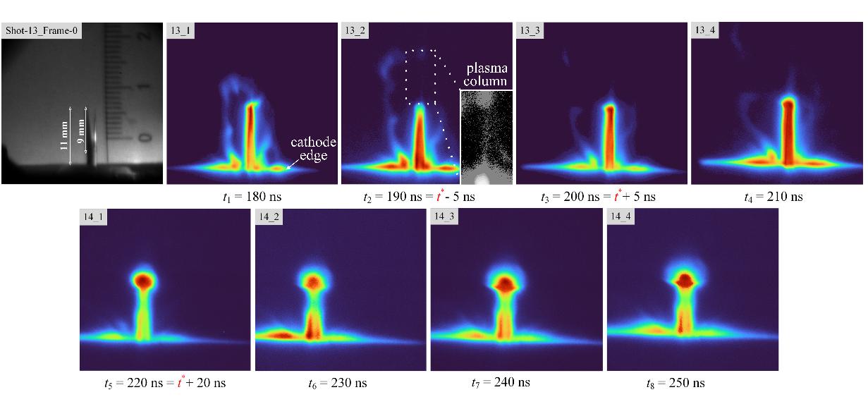 研究結(jié)果表明:EWE等離子體的運(yùn)動(dòng)可分為三個(gè)階段:(1)初始階段,金屬絲爆炸產(chǎn)生等離子體,冷密的絲芯主體質(zhì)量與電流路徑保持靜止;(2)運(yùn)動(dòng)階段,部分等離子體受磁壓力作用向陽極桿尖端移動(dòng);(3)X射線輻射階段:受等離子體不穩(wěn)定影響,原電流路徑耗散,電子在磁絕緣的陰陽極間隙中發(fā)射與加速,在陽極尖端聚焦,產(chǎn)生X射線輻射。此外,研究團(tuán)隊(duì)通過電路分析發(fā)現(xiàn),二極管電壓在X射線輻射前開始上升,這一階段的電壓主要來源于等離子體的高速運(yùn)動(dòng)及其電流回路擴(kuò)張帶來的電感的快速變化。隨著原電流路徑的耗散,二極管阻性電壓形成強(qiáng)電場(chǎng)加速電子,*終產(chǎn)生高能X射線。同時(shí),研究團(tuán)隊(duì)利用FLASH磁流體模擬進(jìn)一步驗(yàn)證了實(shí)驗(yàn)發(fā)現(xiàn)。本研究首次系統(tǒng)性地揭示了WS-RPD的等離子體動(dòng)力學(xué)過程,并為未來優(yōu)化低阻抗RPD的X射線轉(zhuǎn)換效率提供了實(shí)驗(yàn)數(shù)據(jù)和理論模型。