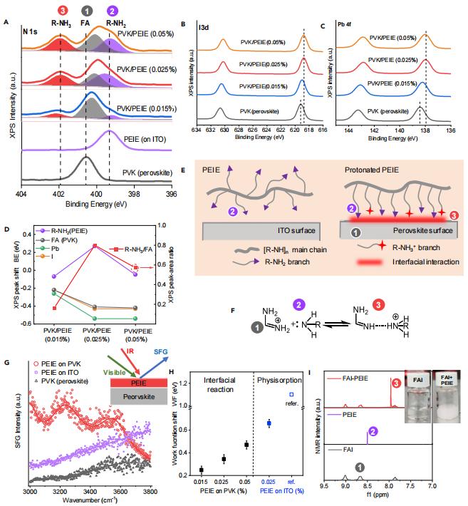 圖1 (A) 裸鈣鈦礦(圖中稱為“PVK”)在ITO上的N 1s XPS譜圖,裸PEIE在ITO上的N 1s XPS譜圖,以及不同濃度(0.015%–0.05%)PEIE包覆的鈣鈦礦的N 1s XPS譜圖。在XPS譜圖中識(shí)別并擬合了三種氮的成分:鈣鈦礦中的甲酰胺(FA)基團(tuán)(記為峰1,灰色);PEIE中的胺基團(tuán)(R-NH2,峰2,紫色);以及PEIE中質(zhì)子化的胺基團(tuán)(R-NH3+,峰3,紅色)。(B)和(C) 分別為不同濃度PEIE包覆的鈣鈦礦的I 3d (B) 和Pb 4f (C) 的XPS譜圖。(D)從N 1s XPS譜圖擬合曲線中提取的質(zhì)子化胺(峰3)與FA(峰1)的XPS峰面積比(紅色方塊)。PEIE包覆的鈣鈦礦相對(duì)于裸鈣鈦礦的Pb 4f(綠色圓圈)、I 3d(橙色圓圈)和FA(黑色圓圈)峰的結(jié)合能偏移;PEIE在鈣鈦礦上相對(duì)于裸PEIE在ITO上的胺(R-NH2,紫色圓圈)峰的結(jié)合能偏移。負(fù)值表示結(jié)合能向低能級(jí)偏移。(E) PEIE在ITO上的物理吸附示意圖(左)和原位質(zhì)子化PEIE在鈣鈦礦上的化學(xué)吸附示意圖(右)。(F) 提出的鈣鈦礦/PEIE界面處的反應(yīng)公式。方案(E) 和(F)中的圓圈1、2和3分別對(duì)應(yīng)XPS譜圖(A)中的氮峰1、2和3。(G) PEIE在ITO上、PEIE在鈣鈦礦上以及鈣鈦礦在ITO上(PVK)的和頻光譜(SFG)圖。插入圖顯示了SFG測(cè)試方法。(H) ITO上覆蓋PEIE后的功函數(shù)(WF)偏移,相對(duì)于裸ITO(藍(lán)色實(shí)心方塊,參考文獻(xiàn)中的數(shù)據(jù)用藍(lán)色空心方塊表示)。鈣鈦礦上覆蓋PEIE后的功函數(shù)偏移,相對(duì)于裸鈣鈦礦(黑色實(shí)心方塊)。誤差條表示標(biāo)準(zhǔn)偏差。(I) FAI、PEIE以及FAI與PEIE反應(yīng)產(chǎn)物的¹H NMR譜圖。插入圖顯示了FAI溶液在與PEIE反應(yīng)前后的照片。